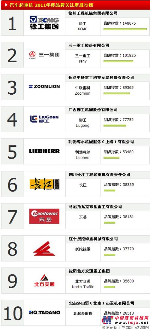 2011中國汽車起重機品牌關注度TOP10排行榜注:本排行榜中的品牌點擊人氣可能受企業(yè)上榜產(chǎn)品的數(shù)量及與該品牌在中國地區(qū)的市場影響力左右,排名的最大的意義是反映中國工程機械用戶對該品牌的關注程度的體現(xiàn)。排名結果不能代表該品牌本身的產(chǎn)品、價格、質量、服務等方面的價值因素。